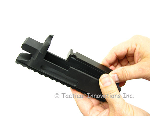 Using the barrel portion of the jig, slide the jig into the receiver and clamp between the bottom of the jig and the top rail of the receiver.